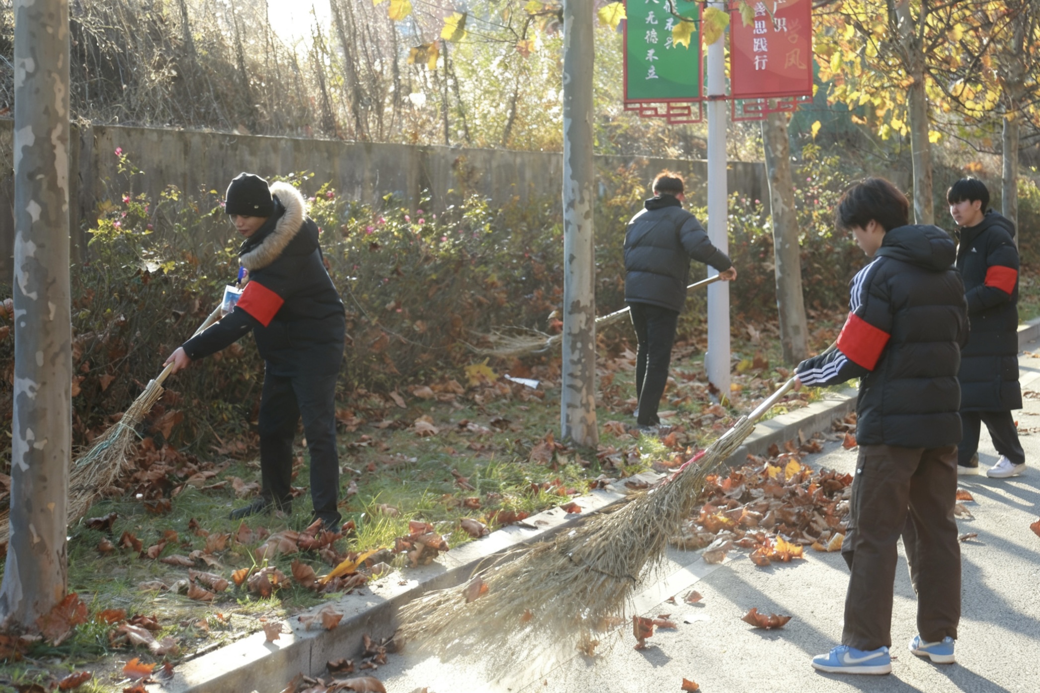 活动中,队员们带着清扫工具,分工协作、默契配合。红色袖标在金黄落叶的映衬下格外耀眼,成为校园里一道温暖的风景线。大家不怕脏、不怕累,用双手清理每一处落叶堆积点,用行动诠释着责任与担当,让校园主干道在秋风中始终保持干净整洁。