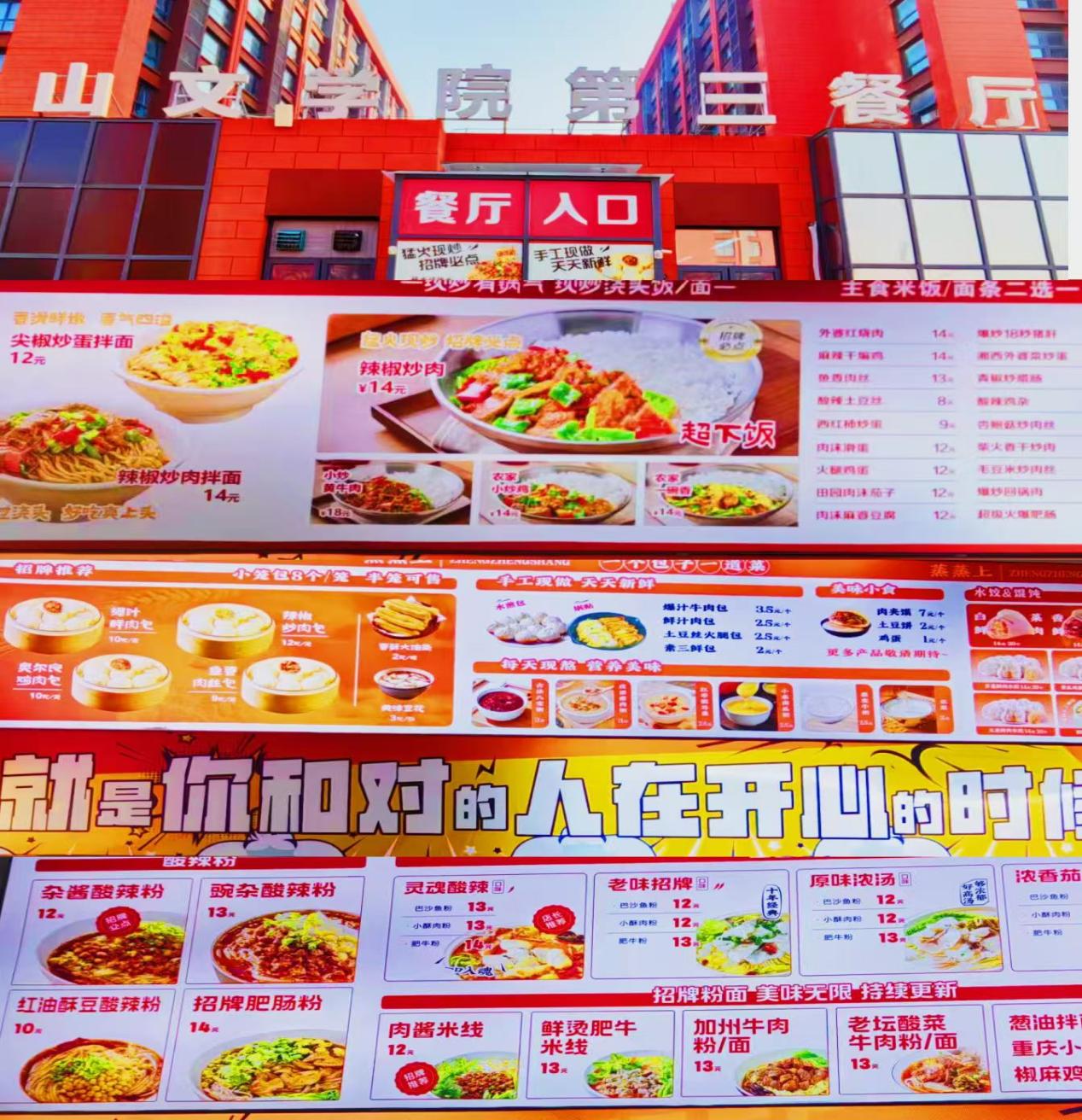 三餐厅的盖浇饭酱香浓郁,现磨豆浆醇厚丝滑,五谷渔粉鲜香扑鼻。