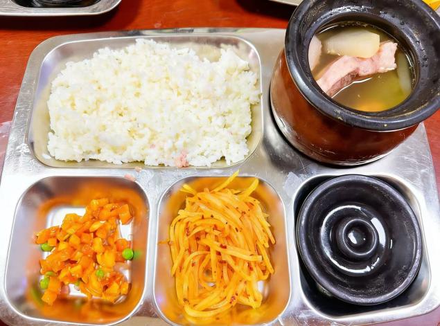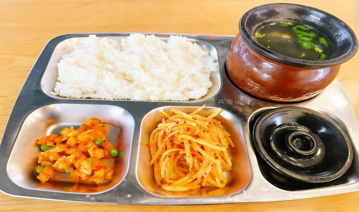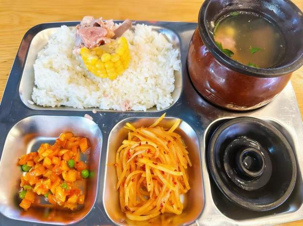 担心口味单一?不存在的!鸡蛋瘦肉汤鲜掉眉毛,香菇母鸡汤补气养颜,冬瓜排骨汤清淡养胃,十余种口味,可选择性很多。考虑到口味重的同学,商家还贴心搭配了酸辣土豆丝和小咸菜,都是免费续的,性价比很高,让同学们既能喝好又能吃饱。
